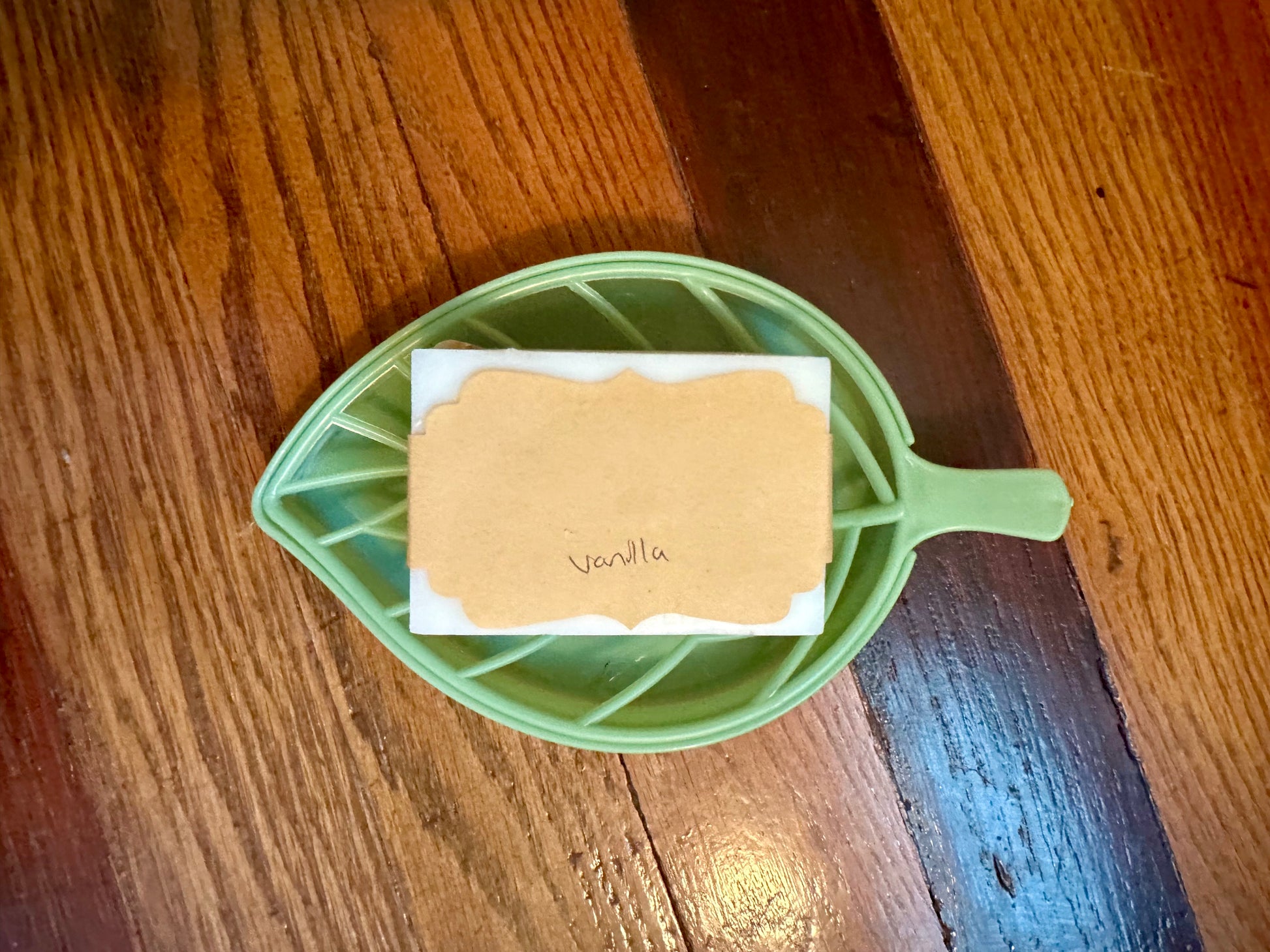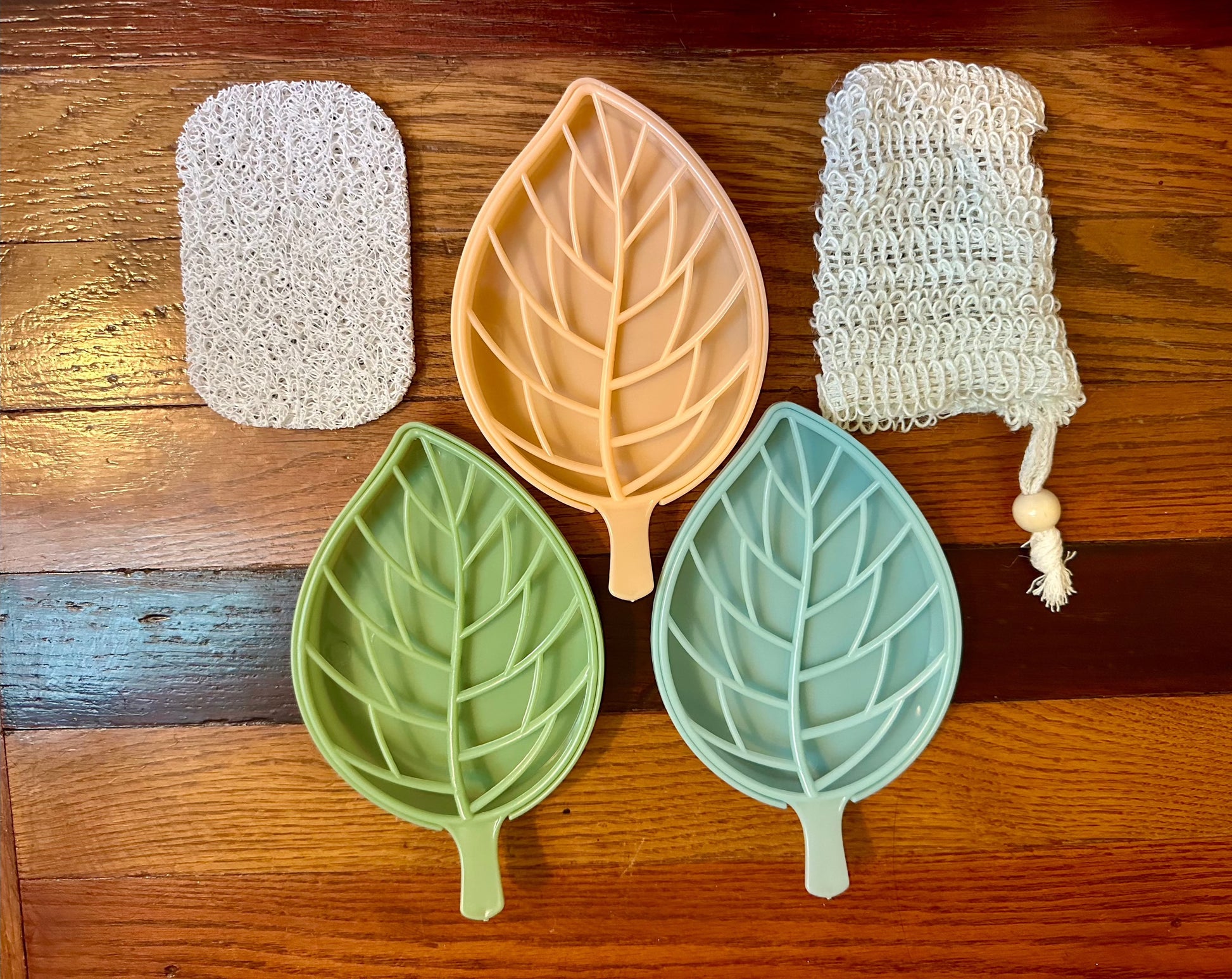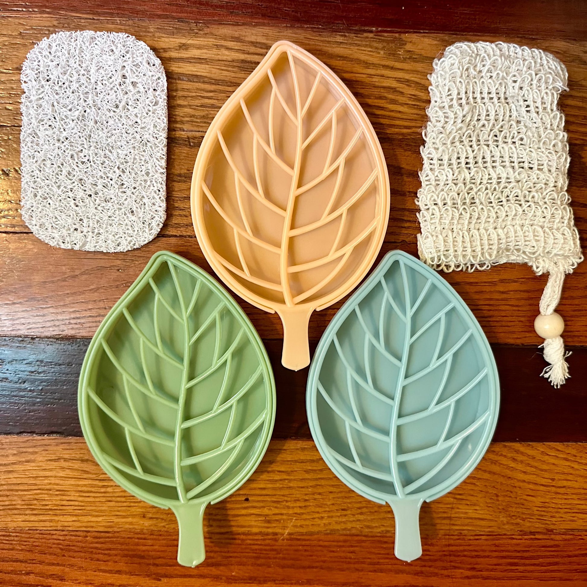 Plastic leaf soap trays that make your soap bars last longer! We also have Soap saver bags. When your soap gets small you can put it in the cotton mesh bag and keep using it! It's a great gentle exfoliator. We Lastly have the regular mesh soap saver.